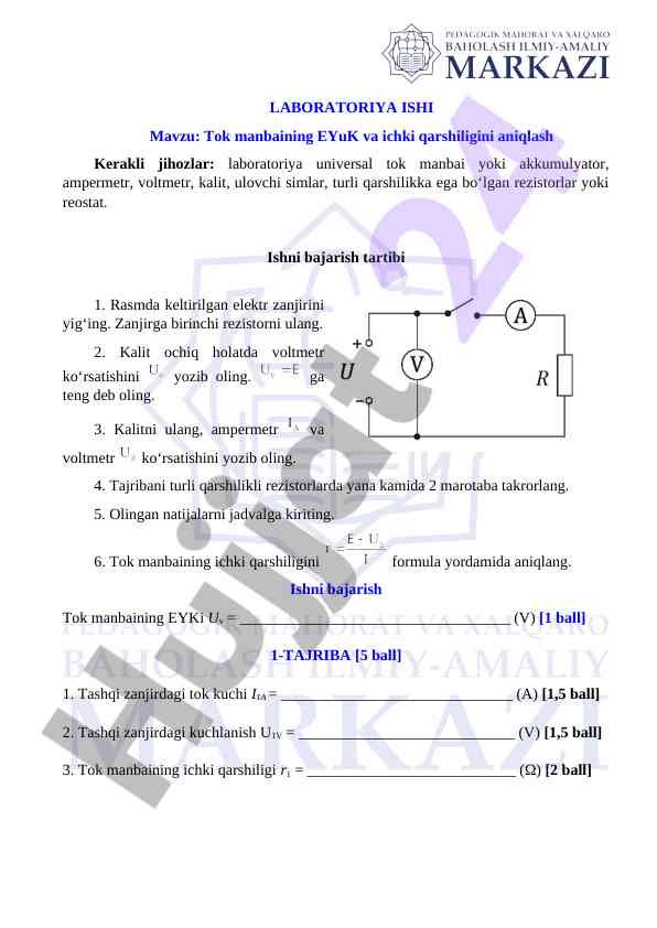 Tok manbaining eyuk va ichki qarshiligini aniqlash