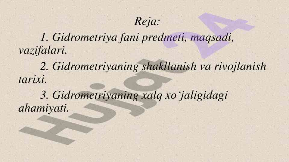 Bu ish gidrometriya fanining mazmuni, maqsadlari va ahamiyatini o'z ichiga oladi. Fanning tarixiy rivojlanishi ham o'rganiladi.