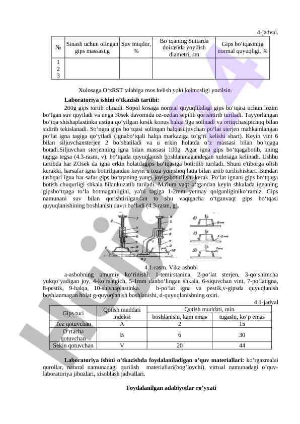 Laboratoriya ishida gipsli bog‘lovchilarni quyuqligi, qotishini boshlanishi va oxirini aniqlash jarayonlari tavsiflanadi. Asbob-uskunalar va o'lchov me'yorlari haqida ma'lumotlar berilgan.