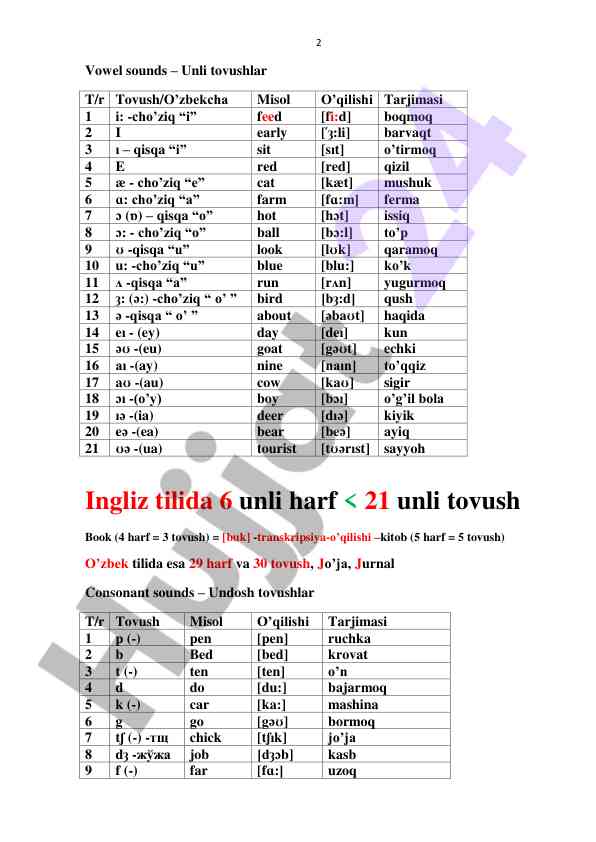 Ingliz tilidagi unli harflar va ularning o'qilishi, O'zbek tilidagi unli tovushlar bilan taqqoslash.