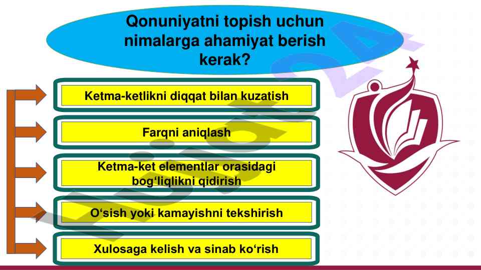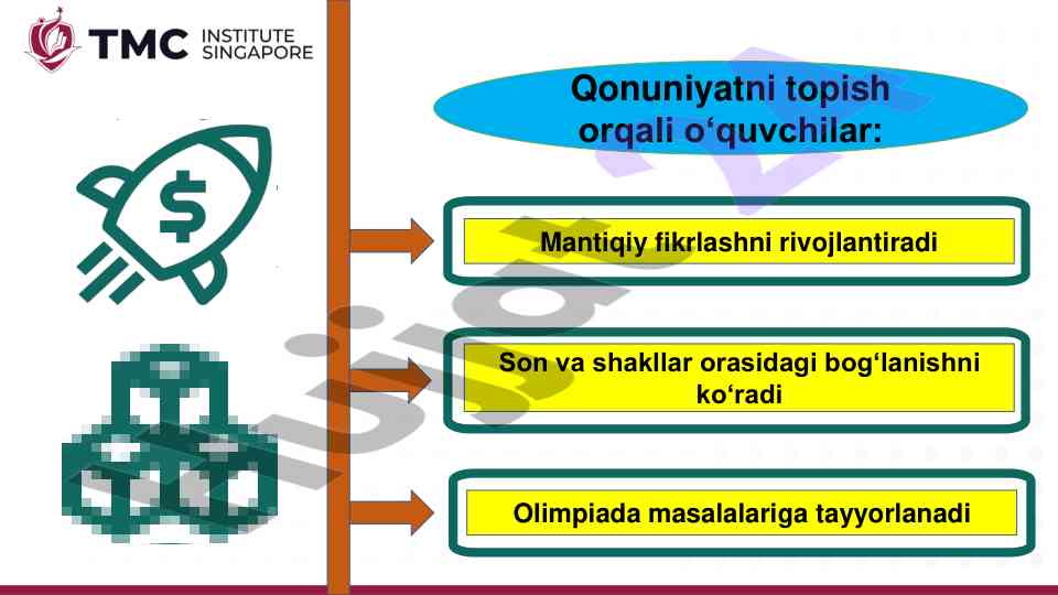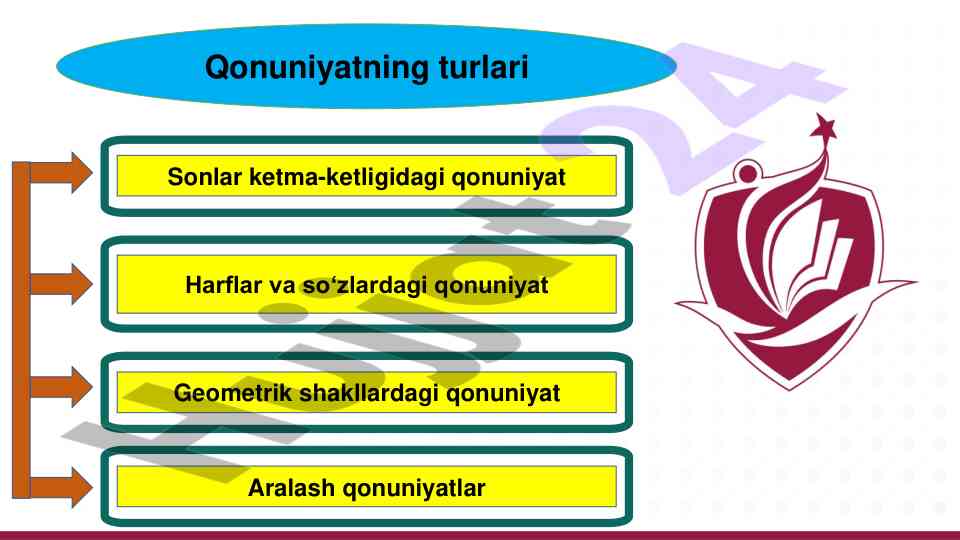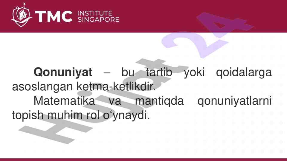 Matematika va mantiqda qonuniyatlarni topish uchun zaruriy qoidalar va tartiblar. O'quvchilarga mantiqiy fikrlashni rivojlantirishda yordam beradi. Olimpiada masalalariga tayyorgarlik.