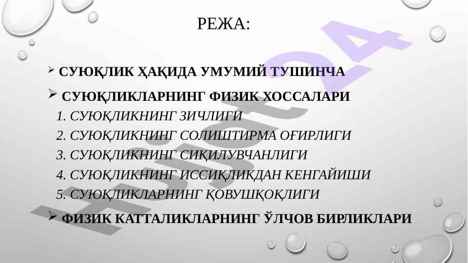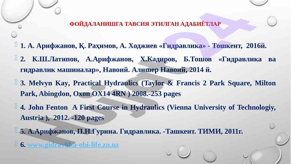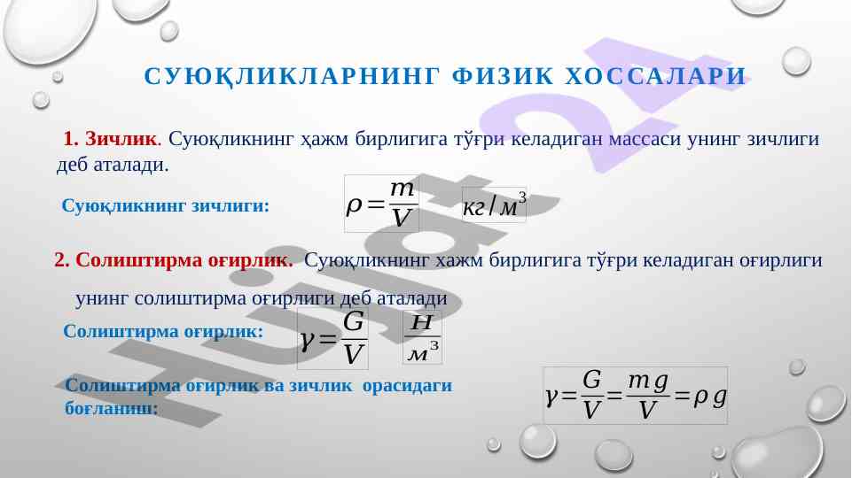 Суюқликларнинг физик хоссаларини характерловчи катталиклар, омишларар ва гидравлика мавзусидаги масалаларнинг ечими.