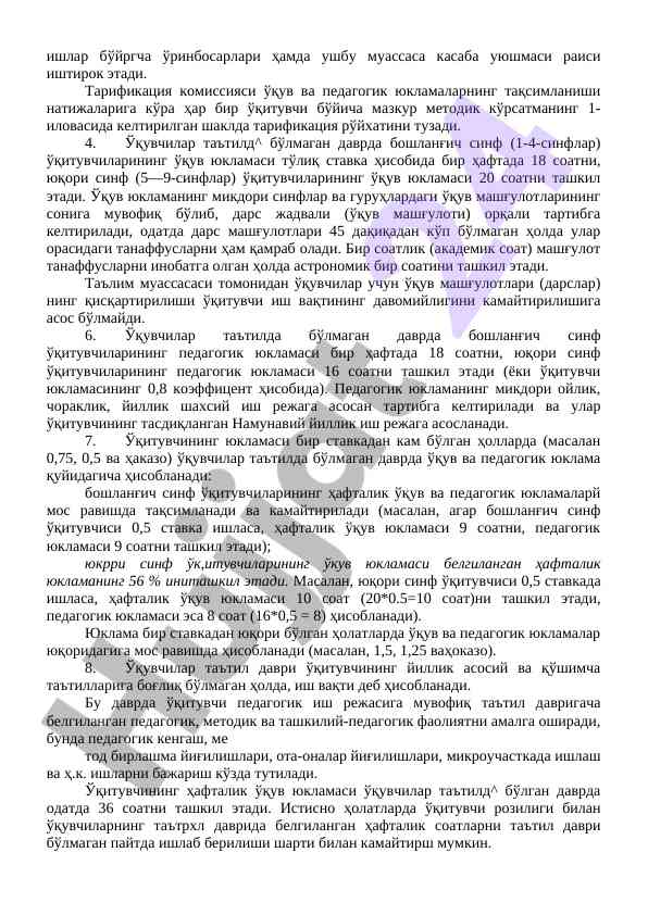 Ushbu metodik ko'rsatmalar umumiy ta'lim muassasalari o'qituvchilarini tarifikatsiya qilish, ish vaqtini hisobga olish va ish haqini hisoblash tartibini belgilaydi.