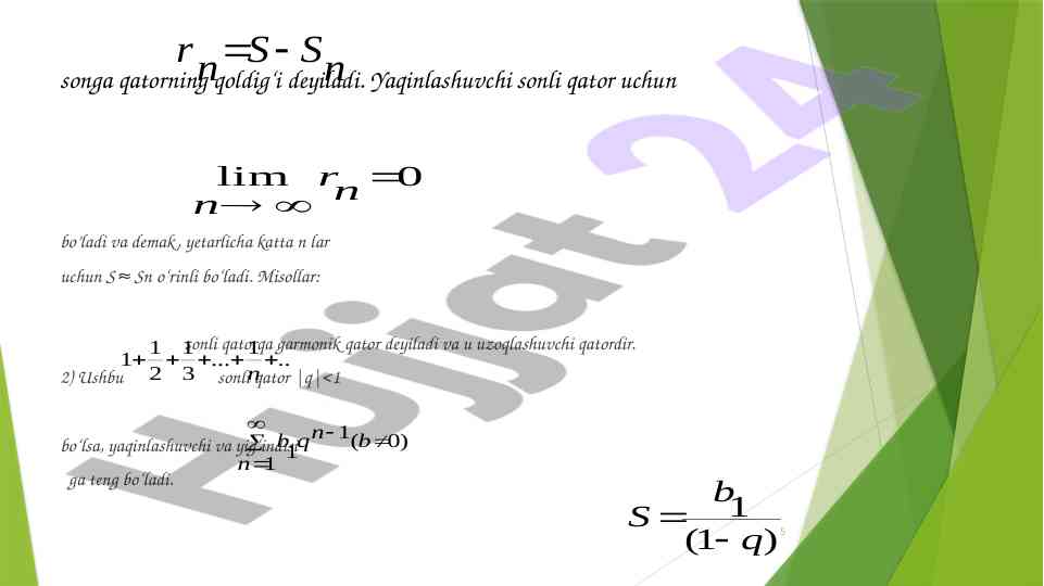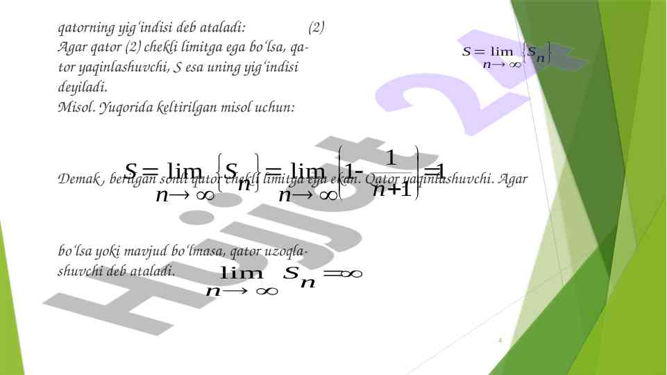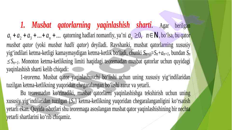 Yaqinlashuvchi qatorlar va ularning sodda xossalari, koshi kriteriyasi, musbat hadli qatorlar va yaqinlashish shartlari haqida tushuntirishlar.