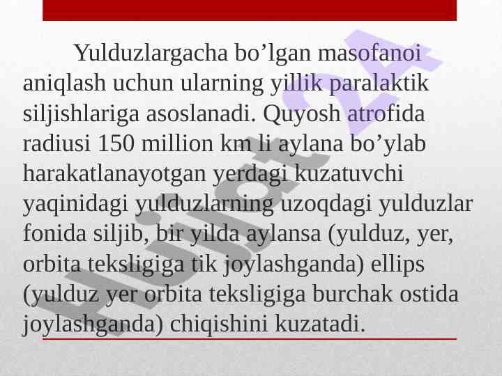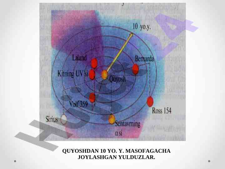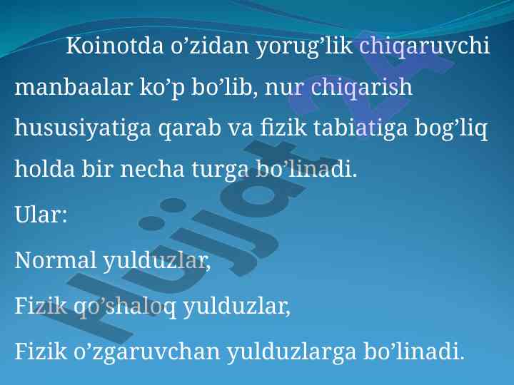 Yulduzlar koinotdagi eng ko'p tarqalgan jismlar haqida ma'lumot beruvchi referat. Ularning spektral sinflari, massasi, va yillik paralaks haqida tahlil.
