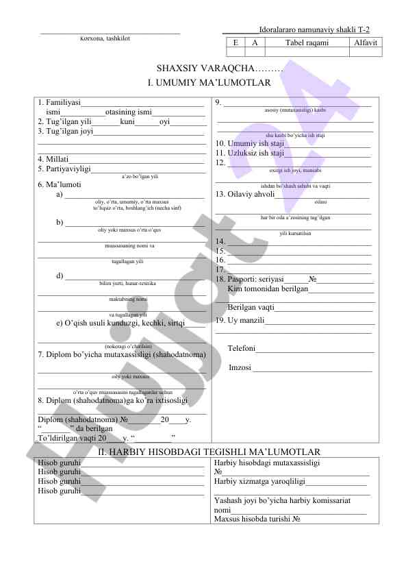 T2 forma shaxsiy varaqa kartasi namuna blankasi 1000 SUM