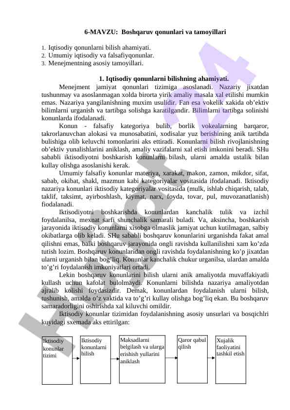 Iqtisodiy qonunlarni bilishning ahamiyati va menejmentning asosiy tamoyillari haqida ma'lumotlar. Iqtisodiy qonunlarni bilish jamiyat qonunlari tizimiga bog'liq bo'lib, nazariy tushunishga va amaliy masalalarni hal etishga yordam beradi.