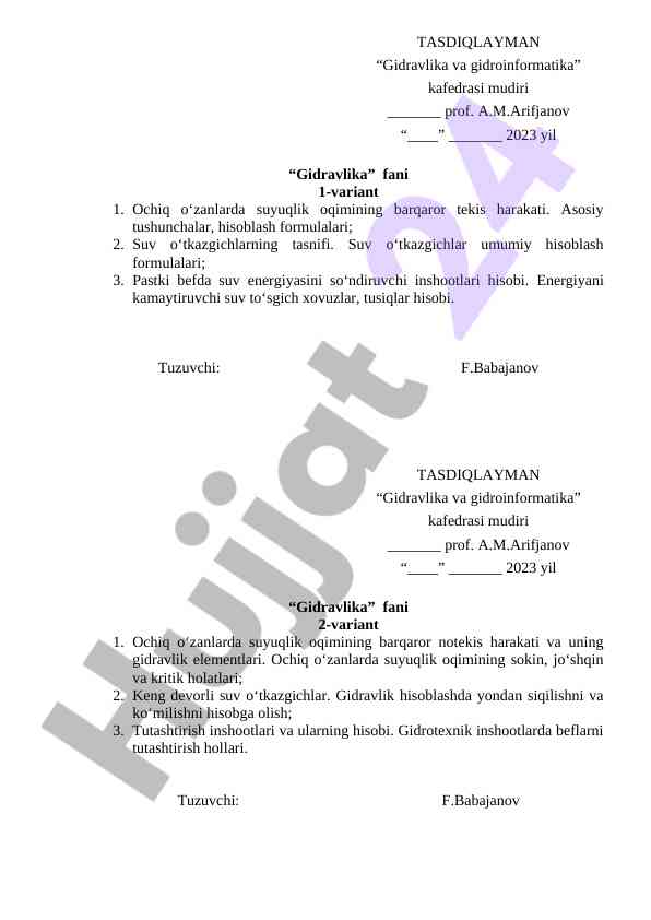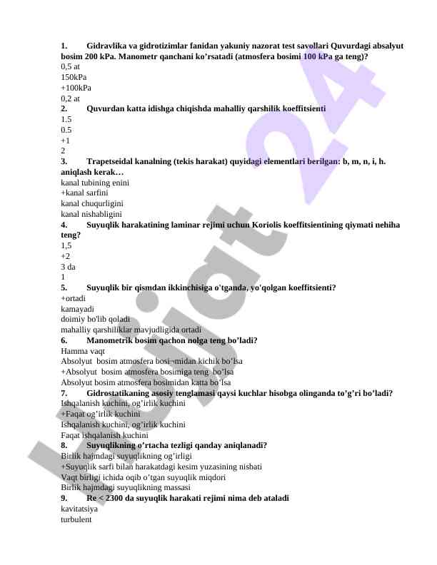 Gidravlika fanida yakuniy nazorat qaydnomasi