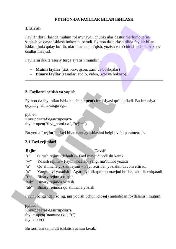 Bu qo‘llanma Python dasturlash tilida fayllar bilan ishlashni yaxshi tushuntiradi. O‘qish, yozish va fayl rejimlari haqida muhim ma’lumotlar taqdim etiladi.